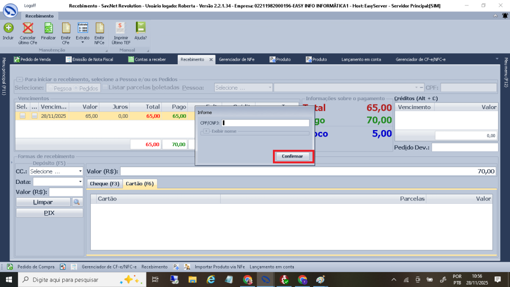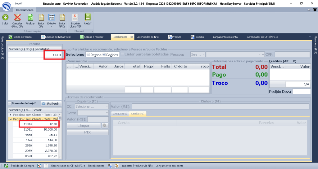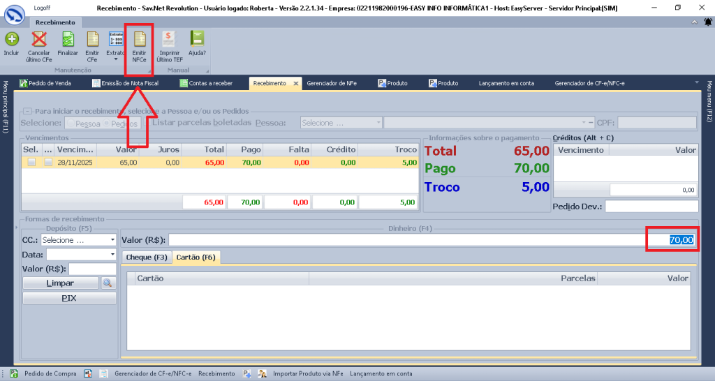 No Revolution temos 3 telas para a emissão, a tela do recebimento, a tela do pedido de venda > receber e o gerenciador Cf-e/ NFc-e