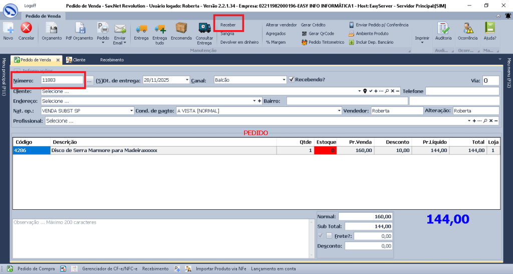 2º Opção Pedido de venda > Receber.