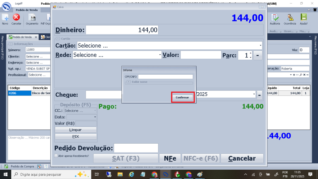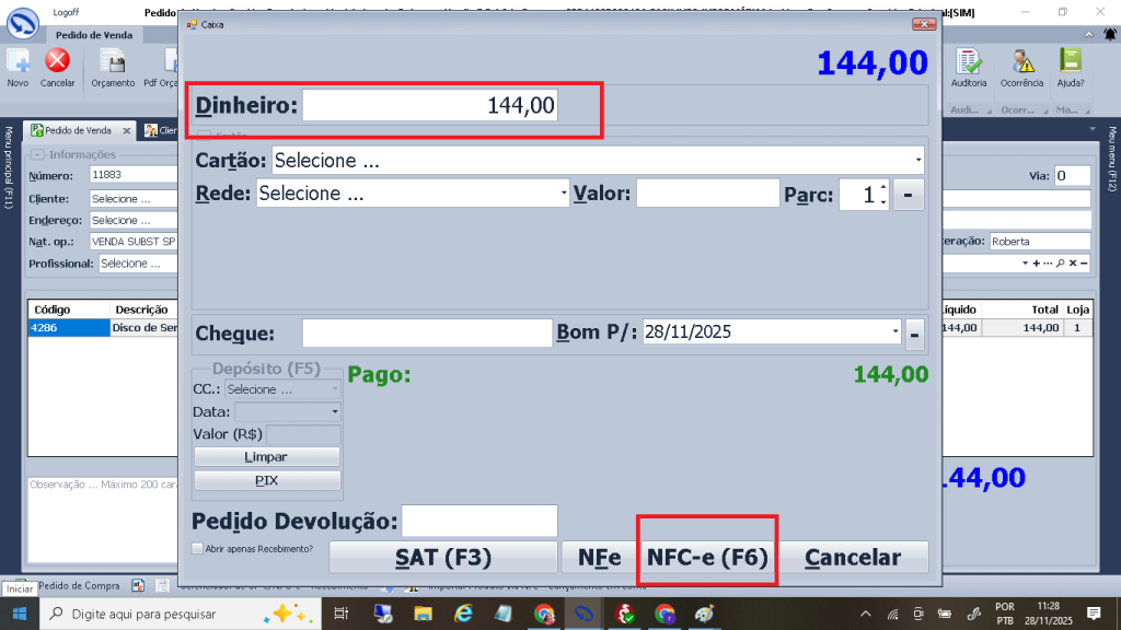 Selecione a forma de recebimento dinheiro, Cartão de debito ou credito, Pix, cheque ou credito da loja. Após selecionar aperte enter para confirmar a forma de recebimento e clique no botão NFC-e (F6).