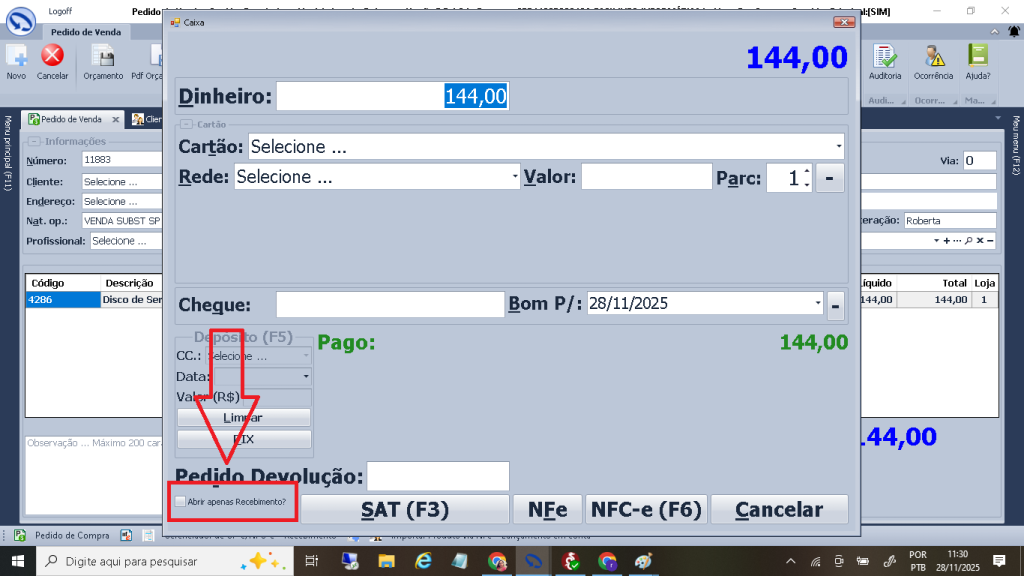 obs. nesta tela não tem a opção de recebimento com deposito bancário, caso queira precisa clicar em abrir apenas recebimento?.