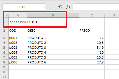 • O campo A1 da planilha deve conter o CNPJ do fornecedor, o mesmo utilizado em seu cadastro no sistema. Informe somente os número e use o símbolo ‘ antes, exemplo ‘72271199000101.