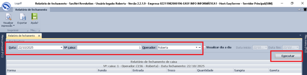 (2) Informe a data do fechamento > No campo “Nº Caixa” digite o número do caixa que deseja visualizar > Digite o operador . Ao final clique em “Executar”;