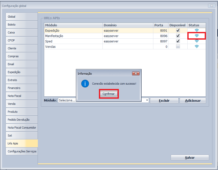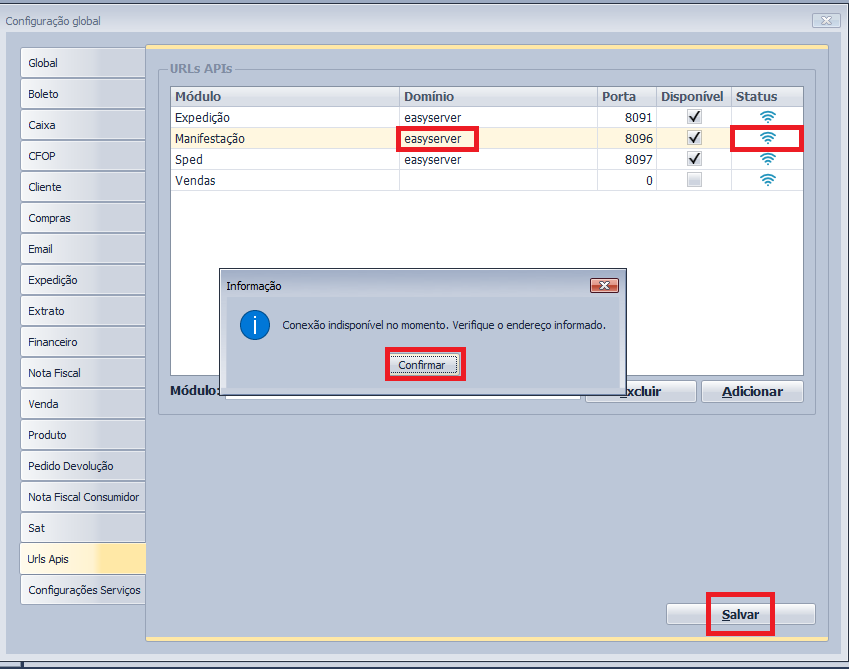 Caso sua conexão esteja indisponível, será necessário corrigir as informações de domínio (numero do IP ou o nome do computador) e/ou porta.