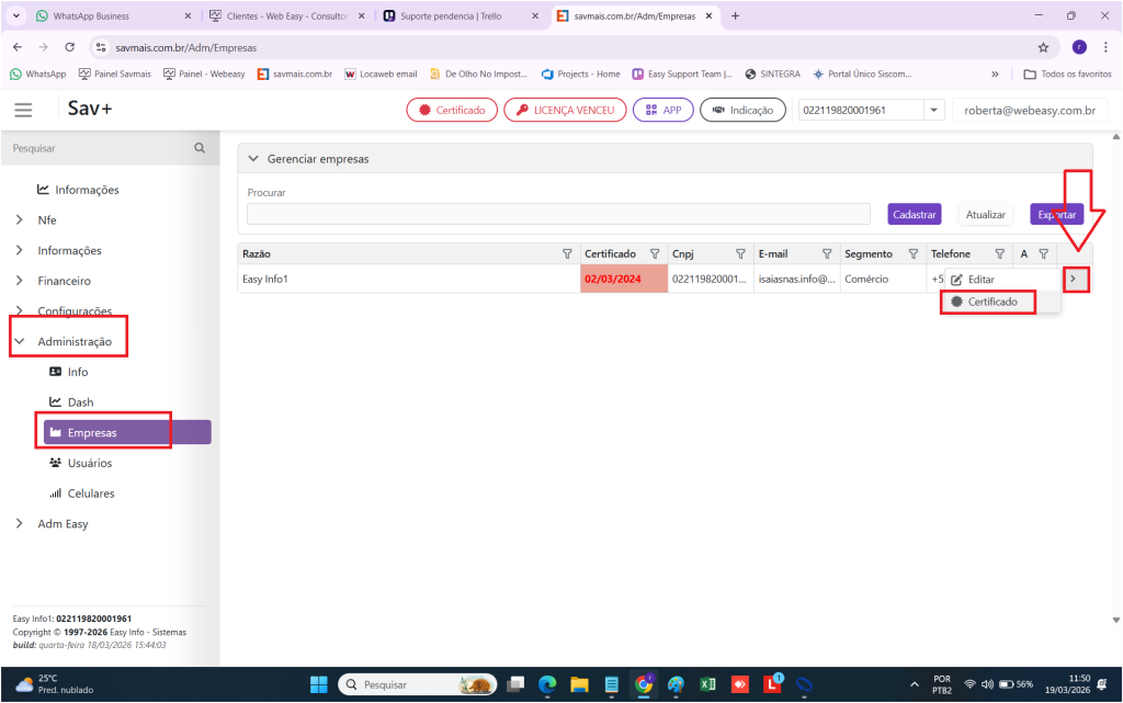 clique em configuração > empresa > clique na seta no final da linha > e selecione certificado