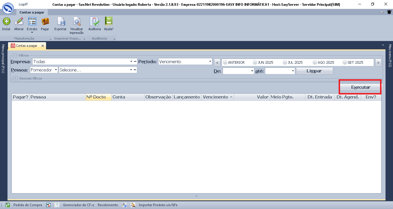 Entre na tela conta a pagar e clique em executar para aparecer as contas já lançadas.