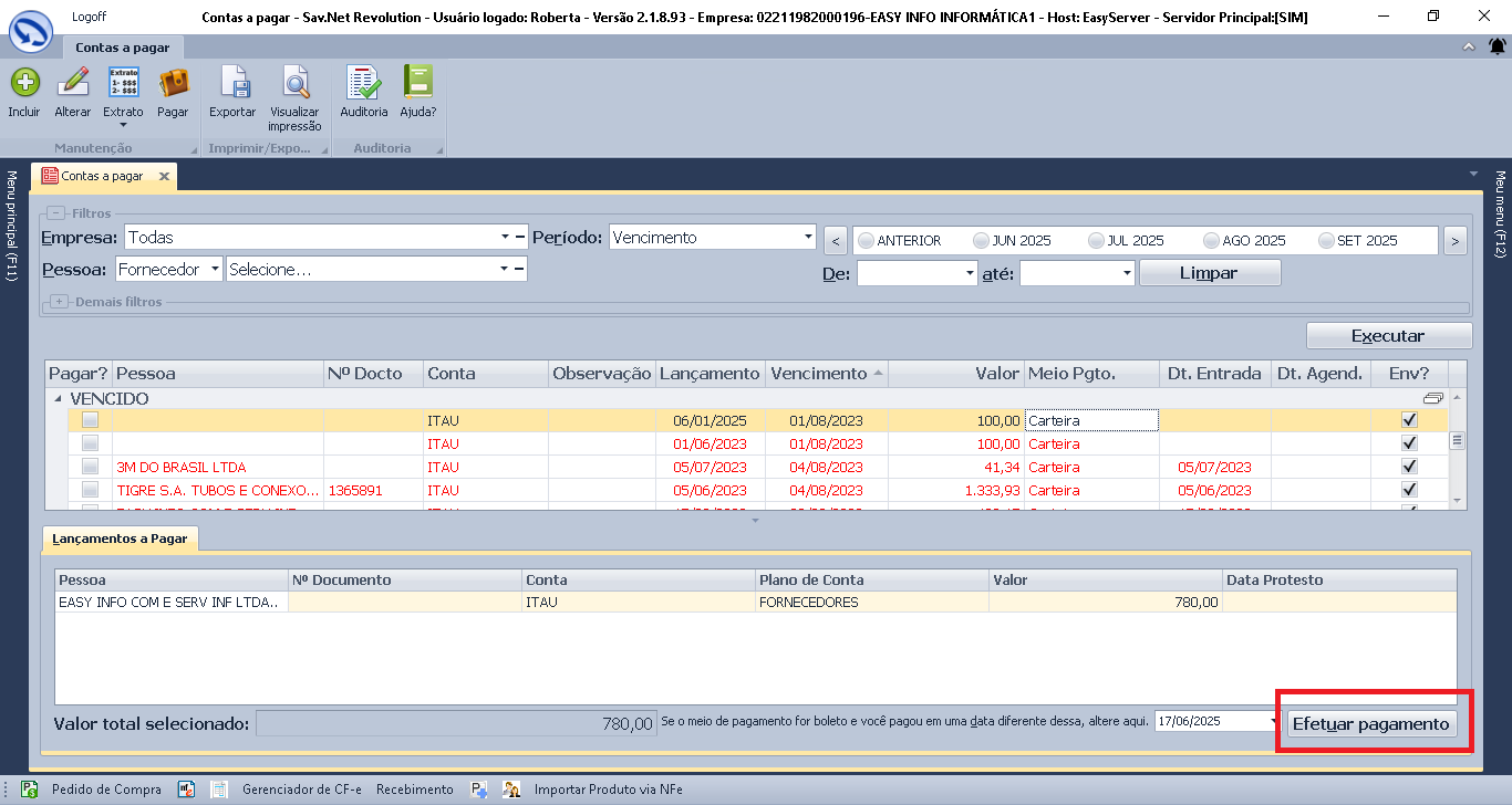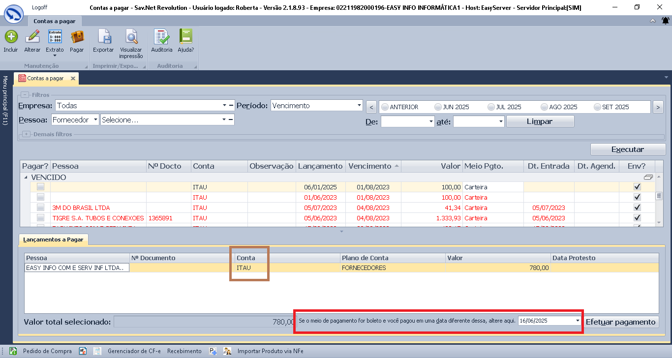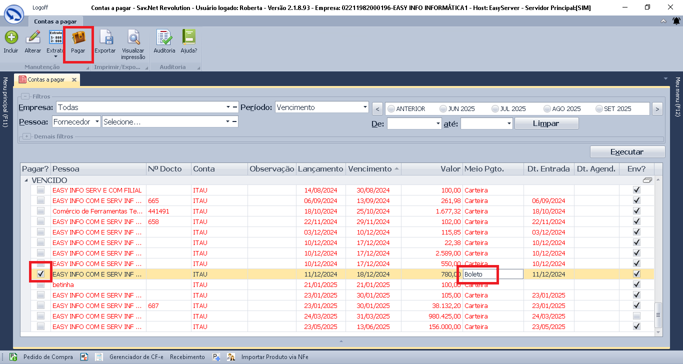 Selecione a conta que deseja > e clique em pagar ou aperte F3 no teclado. Podendo utilizar os filtros para facilitar a busca. Observe se o meios de pgto é Boleto.